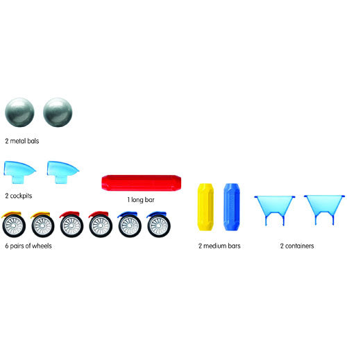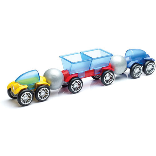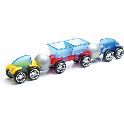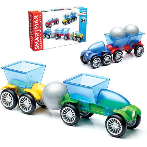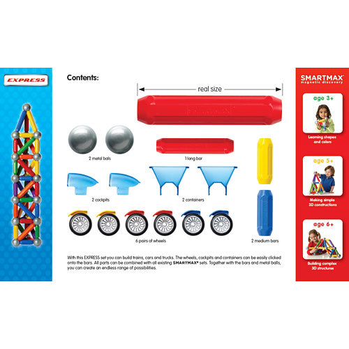 All Aboard!! The SmartMax Express is part of the SmartMax line of magnetic discovery toys. Winner of the Dr. Toy 2011 Best Picks-New Products Award, SmartMax is known for combining the wonders of magnetism and the fascinating world of construction in a way that's safe for young children. The SmartMax Express includes 27 pieces... one long bar, two medium bars, twelve tires, two cockpits, two containers, six clip-on wheel units and two giant 1.8 inch diameter metal balls. With a simple click, the wheels, cockpits and containers easily attach to the magnetic bars to build trains, cars and trucks. The extra-large pieces are specifically designed for handling by young kids as they learn about the effects of magnetic attraction. You'll be amazed by what your child can create! All parts can be combined with all existing SmartMax sets to create an endless range of possibilities. The SmartMax difference.... SmartMax is certified to meet the world's toughest safety requirements with its giant, non-swallowable 1.8" diameter metal balls and specially sonic-welded bars. All SmartMax magnets have the correct strength for their purpose and are made from the highest-quality material that can be found. These magnets can carry up to 60 times their own weight!