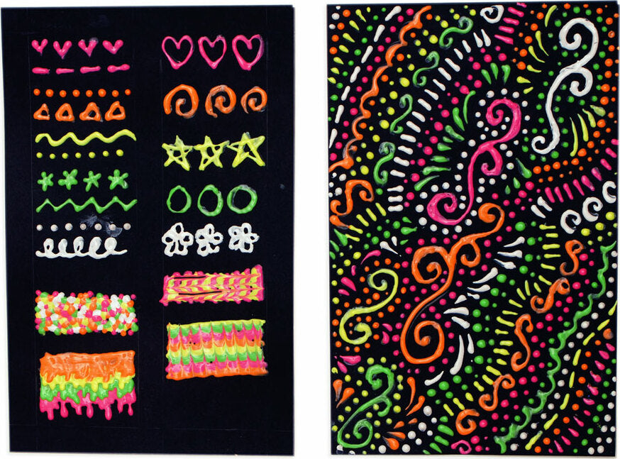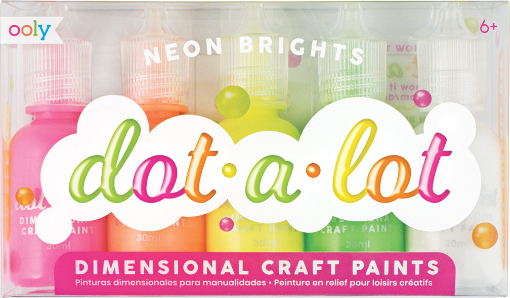 Neon craft paints make any project bold with color and dimension! Choose your surface, from party invites, posters, black paper for a bold dramatic look, accent wood, metal, fabrics, glass and more! Dot-A-Lot Neon Brights Craft Paint allows you to dot, line, do squiggly lines and more by simply squeezing the bottle. Each set of craft paints contains 4 bright neon colors including pink, orange, yellow, green plus a brilliant white. A dose of neon craft paint will add that special spark to school projects, home decor, office space and D.I.Y. homemade projects.