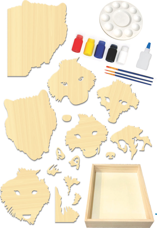 Kids and adults will love the combination of 3D puzzle play with a fine art paint kit. Designed to give you a “creative break”, relieve stress and relax with this unique set featuring laser cut wooden puzzle pieces and a complete paint set - 5 paint colors, 3 brushes, 1 color palette, glue, and a 8”x10” wooden picture frame.
