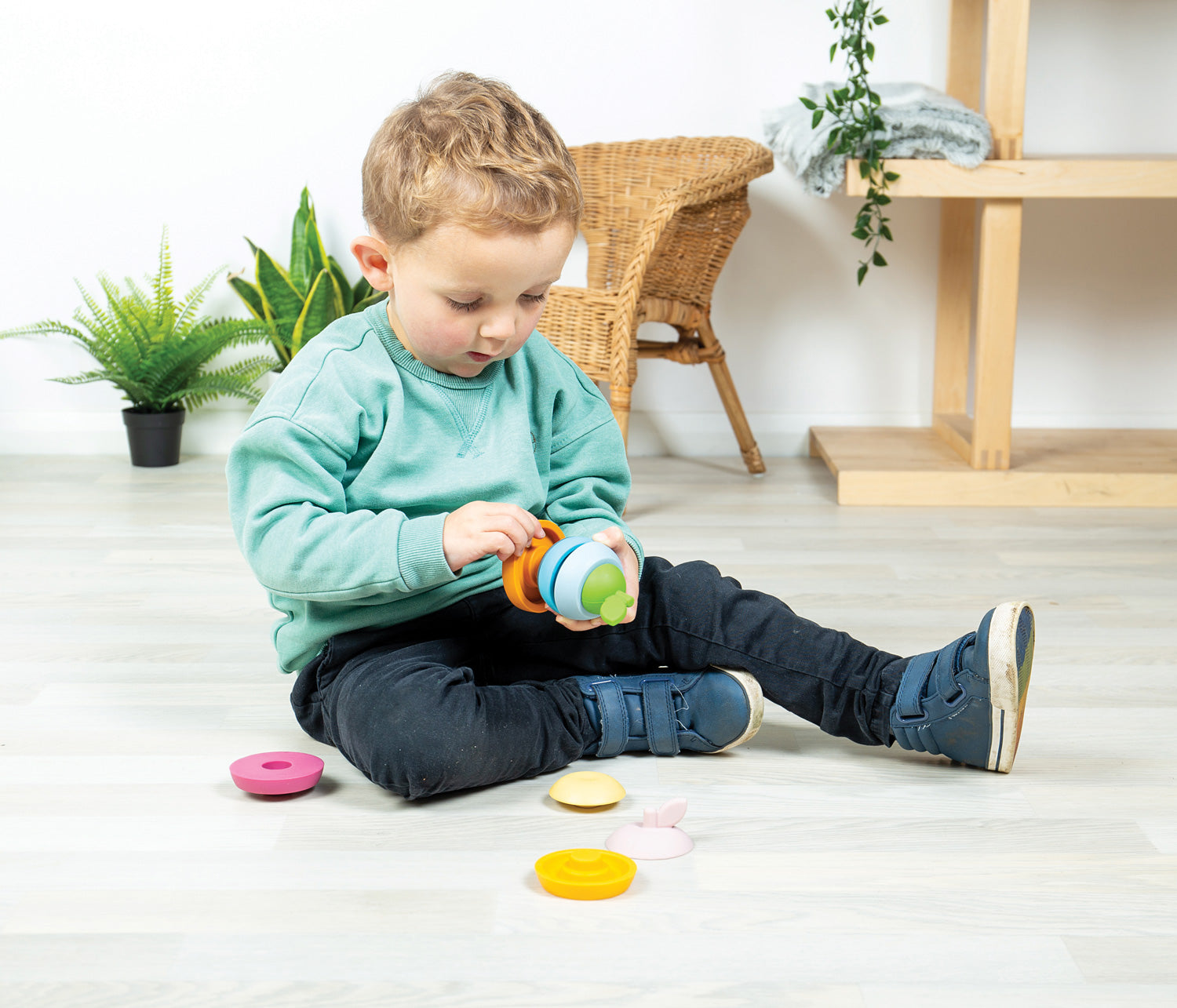 Get to the core of spatial reasoning and hand-eye coordination with a fruity duo! This colorful stacking apple and pear are eco-friendly and easy to clean, made from 100% silicone. Babies and toddlers will find it a-peel-ing to take apart and rebuild the fruit shapes, and will enjoy using them as teethers to soothe sore gums. Dishwasher safe!