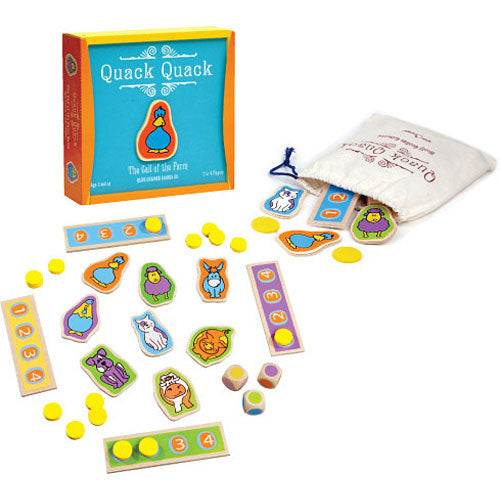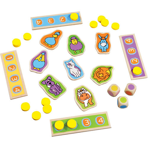 All the colorful animals from the farm are playing in the field. As little helpers, players need to make sure all the animals are on the farm by calling them. Players can call their name "Cow!Duck!Pig!" or make their sound "Moo!Quack,Quack!Oink!". Roll 3 dice and be the first helper to call the animal matching the colors on the dice to win. This game of quick observation will have the whole family mooing like a cow.