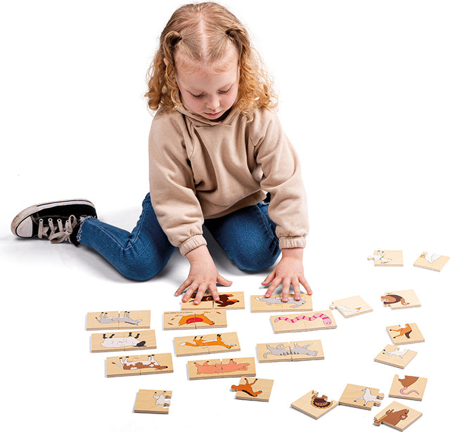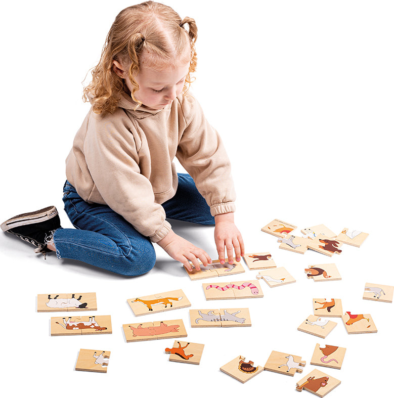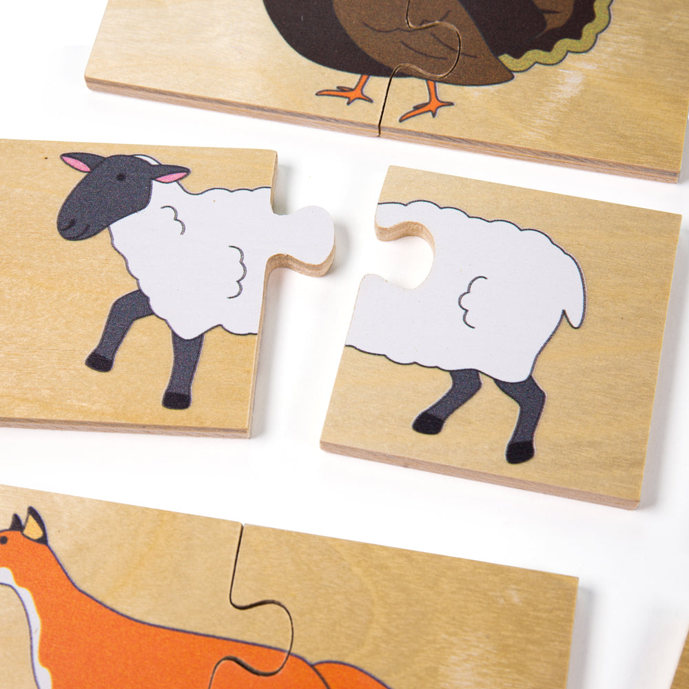 Learn all about different farm animals by correctly matching the wooden puzzle pieces together in this fun matching pairs game. The aim of the game is to match the correct heads and tails of the animals together. Each smooth wooden puzzle piece is generously sized for little hands to easily lift, grasp, examine and replace. Helps to develop hand/eye coordination, matching and animal recognition. It's also a great opportunity to teach children all about the different animal sounds. Made from high quality, responsibly sourced materials. Conforms to current European safety standards and has non-toxic paints and lacquers. 32 play pieces. 3 years +.