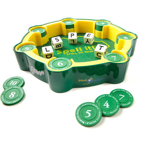 All players now have the ingredients necessary to whipup a word, using at least 3 of the 5 letters. Be the firstto call out a word related to the given theme, andyou win a chip worth the number of letters in yourword. But if you make a mistake, you hit a "stumblingblock" and don't get the chip.The themes include "Home Sweet Home", "Around theWorld," "Famous People," "Sports, Games, andHobbies," "Create a Theme," and "No Nouns."Spell IT Is truly a party game with words! You're part of theaction on every turn. There is always a challenge to get thelongest word in the right theme, and the options are abundant.It keeps your brain busy, while the themes and chance of thedice create a fun atmosphere and keep the action fresh A knack for spelling and vocabulary will help you succeed at Spell it! Rev up your spelling engines... On your marks... Get set... Roll the five alphabet dice! 2 to 6 Players Play Time: 20 Minutes
