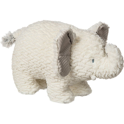 Today's modern mom has embraced neutral color schemes for her baby nursery. Afrique Boutique features neutral grey and white fabrics in textures we love. New for 2017 are several more toys in white and a lion character that warms up with an earthy tan. The expanded palette makes Afrique Boutique work even better with wood floors and accessories. 15" long elephant made from beautifully soft, textured plush that will look fresh years from now. Embroidered eyes. Light grey ribbed ear liners. Labeled machine wash, air dry.