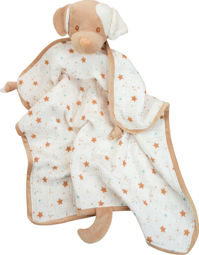 Wrap your baby in warm puppy dog hugs with Douglas' Auggie Tan Puppy Blanki! Made with machine washable, 100% cotton muslin and edged in velvety plush, Auggie's ready for cuddling. A starry print is featured on the body of the Blanki while Auggie's face and tail add charm and whimsy to this extra special lovey. Its lightweight nature makes it simple to pack for trips in the car and stroller rides. Auggie's sweet expression will make him a comforting companion for Baby, while baby-safe embroidered features will win him the approval of parents. Mix and match this playful Blanki friend with any of the other pieces in Douglas' Auggie Tan Puppy collection to create a coordinating set, perfect to give as a gift or to keep for your own nursery.