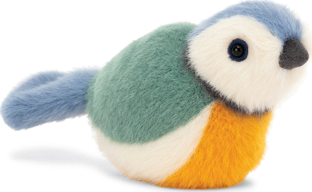 Hopping up to tweet a greeting, it's bonny Birdling Blue Tit! Squat and sweet in swooping blocks of blue, green, mustard and white, this chick is gorgeously gentle. With bright black eyes and a neat grey beak, this blue tit's just a bit beautiful.