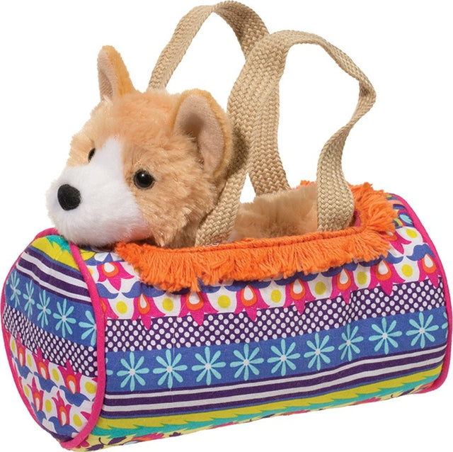Douglas Co., Inc. - Bohemian styled Sassy Pet Sak in vibrant multi-colored motif and jute handles! Adorable pint sized corgi dog fits perfectly inside.