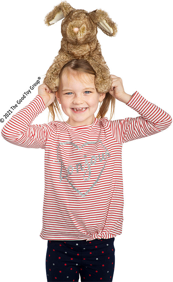 This delightful 17 1/2" plush bunny with creamy colored fur and large, lifelike eyes is just begging to be hugged. Designed in America, made of the highest quality materials, and oh so trendy!