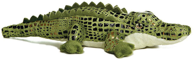 Alli the alligator is 14 inches long from snout to tail and boasts emerald green eyes. Although he looks rather spikey, he's actually soft and cuddly!