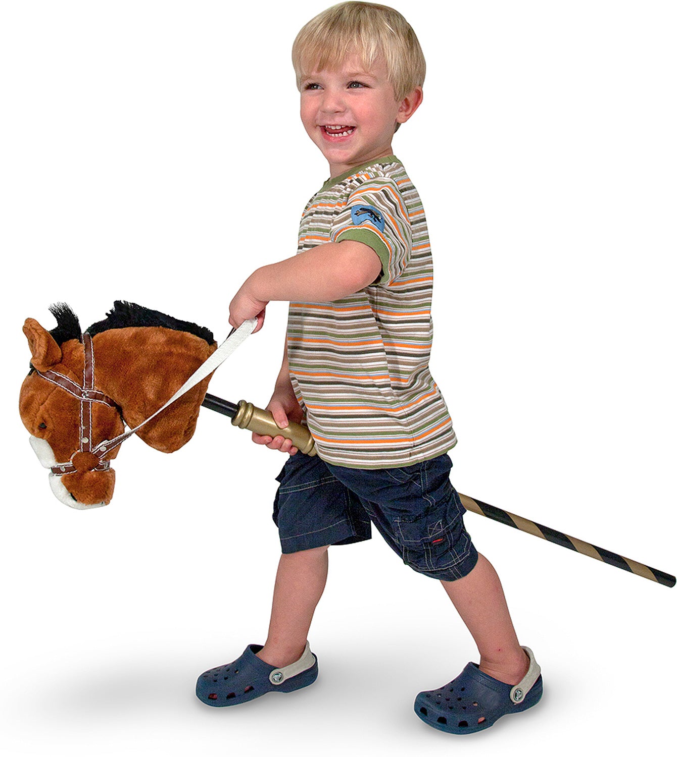 Gallop and trot with this terrific stick pony. When its ear is pressed, listen to the playful horsey sounds. Excellent quality construction for years of "horseplay'! With attention to detail, it includes features such as, ultra-soft, furry fabric, a hand carved and painted stick handle, and easy-clean reins.