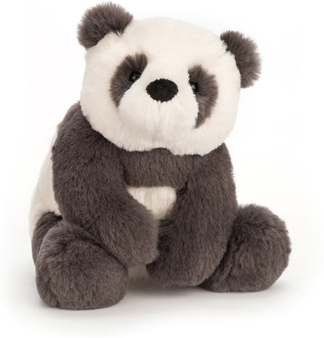 Tubby and ticklish, Harry Panda Cub is such a cuddly chap. His charcoal-grey and creamy fur is velvety-soft and so beary snuggly. Harry's beany feet help him sit up, and his lollopy legs swing about when he's carried. We love his bobbly tail the best!