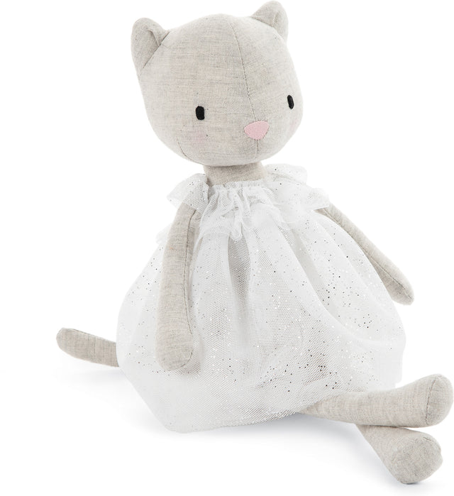Jolie Kitten is so, so sweet, with a gentle expression and pink blush cheeks. This classic kitty's dove-grey fur is lineny-cotton for fewer sneezes. Shimmer-serene in a gauzy white dress with glittering silver sparkles, Jolie Kitten is a beautiful first gift.