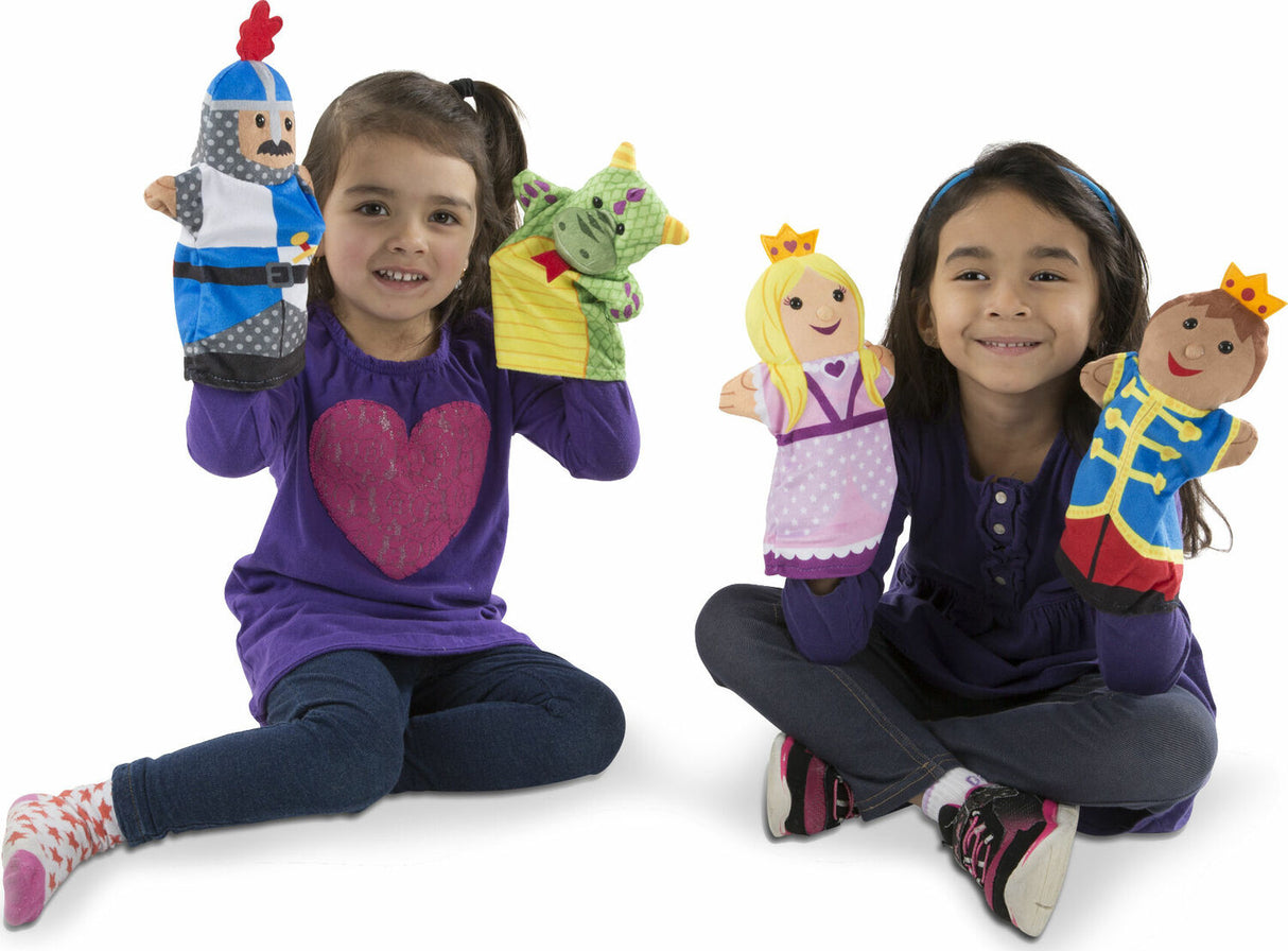 This four-piece hand-puppet set includes a royal collection of characters! Designed to help children and caregivers role-play together in a sweet and simple way, the prince, princess, knight, and dragon are sure to inspire countless creative stories and amazing imaginary adventures. The simple glove puppets fit children and adults and are easy to use, so even the littlest puppeteers can see exciting movement with very little skill-terrific for self-confidence, and also an invaluable booster for motor skills, hand-eye coordination, communication skills, parent-child bonding, and so much more! Made with brightly patterned, washable fabrics and built to last, these soft and sweet hand puppets are sure to be go-to toys for years to come.