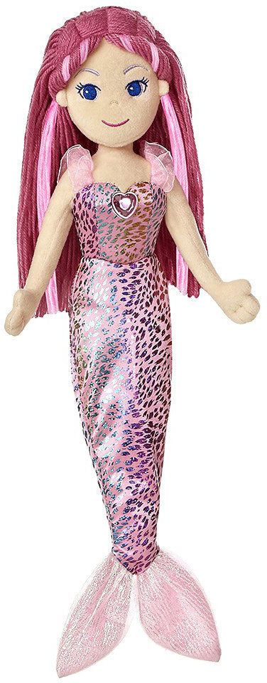 17" MARYN - MEDIUM Sea Sprites are the cousins of Sea Sparkles and they play in the shimmering blue waters of the Sparkles reef bay. Maryn is a gorgeous shimmering mermaid with pink rainbow dress and sparkly jewel, dark pink hair and light pink highlights. Collect them all!