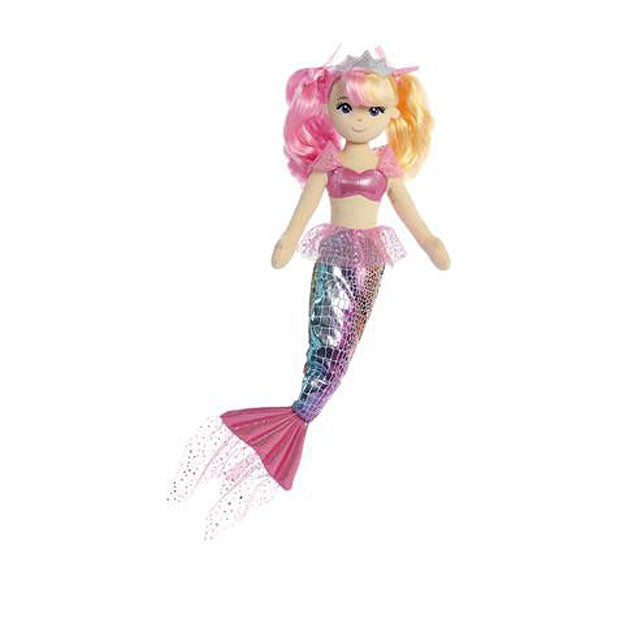 SEA ROSE 18"- Sea Sparkles Rainbows put together the award-winning Sea Shimmers design with brand new colors and combinations! Sea Rose is a mermaid with pink and orange hair, a gorgeous rainbow tail, and a bright silver crown.