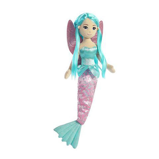SHELLINA 18"- Sea Fairies from Sea Sparkles are brand new sea shimmers with fairy wings and beautiful hair! Shellina is a sea fairy mermaid with teal hair, a gorgeous shimmery pink and teal tail, and pretty pink wings.