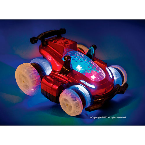 This little side-winding stunt car is commandeered by the daredevil with the remote control. He'll move it forward, backward, right and left, as the wheels rotate side to side. It'll race, spin, hover and even stand upright. Lower the lights, and 6 LED lights add a whole new dimension. Requires 8 AA batteries. For ages 5-10 yrs, from Mindscope.