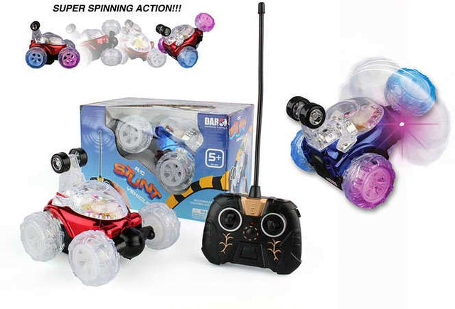 Remote Control Stunt Vehicle. Assorted colors, Red or Blue. Comes with 5 sounds and mute. Does flips and stunts. Instructions for advanced moves on the packaging. item is 4.5 inches high 5 inches wide and 5 1/4 inches long frequency is 27 MHz