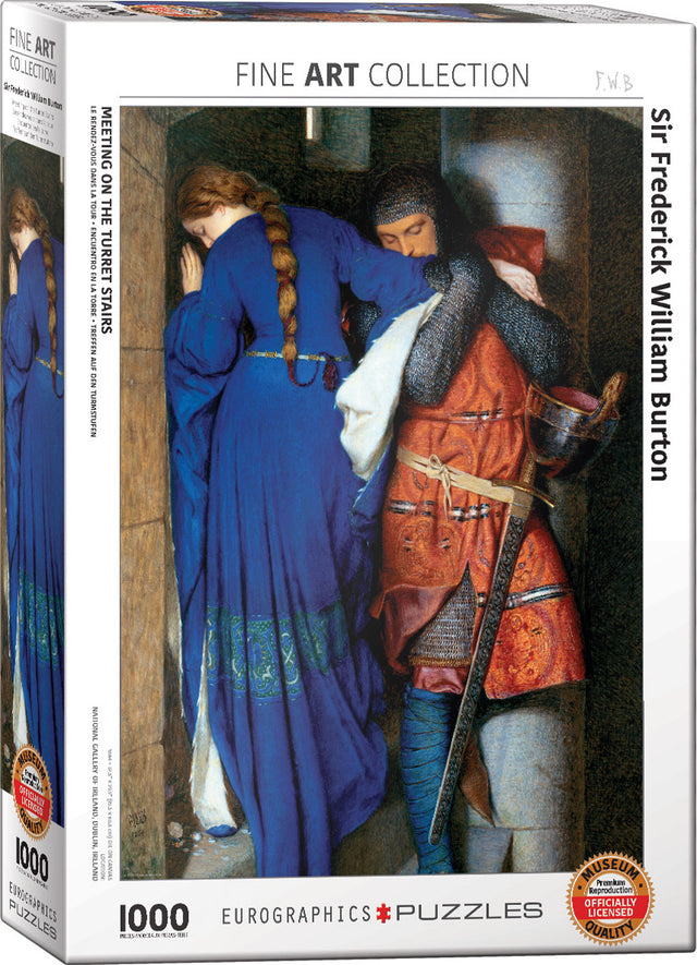 EuroGraphics Meeting Turret Stairs by Frederick William Burton 1000-Piece Puzzle. Box size: 10" x 14" x 2.37". Finished Size: 19.25" x 26.5". The 'Meeting on the Turret Stairs' theme by Frederick William Burton (1816-1900) comes from a medieval Danish ballad which describes how Hellelil fell in love with Hildebrand, Prince of Engelland with tragic results. Strong high-quality puzzle pieces. Made from recycled board and printed with vegetable based ink. This superior quality puzzle will delight and educate all at the same time.