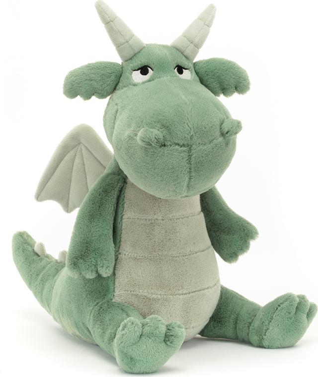 Adon Dragon loves to daydream, with sleepy eyes and a goofy grin. This mossy dragon has soft winged ears, a long spined tail and chunky toes, with sage suedette wings, horns and tummy, all stitched with careful detail.