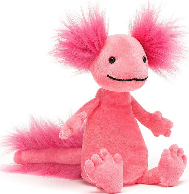 Loveably luminous, Alice Axolotl is a whole lot of kooky in hot pink floof! This ambling amphibian is bubblegum-bright, with squidgy-soft feet, a goofy grin and a supercool long fuzzy tail! Alice waggles her tufty gills as she trots along the seabed!