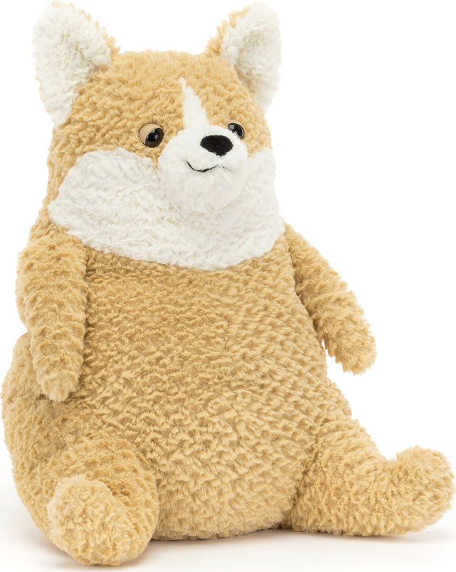 Amore Corgi is chunky and rumpled, with butterscotch fur, cream bib and ears, and an inkdrop suedette nose. A fine companion for afternoon naps, this gorgeous corgi has neat comma feet and a tummy you’ll want to curl up on.