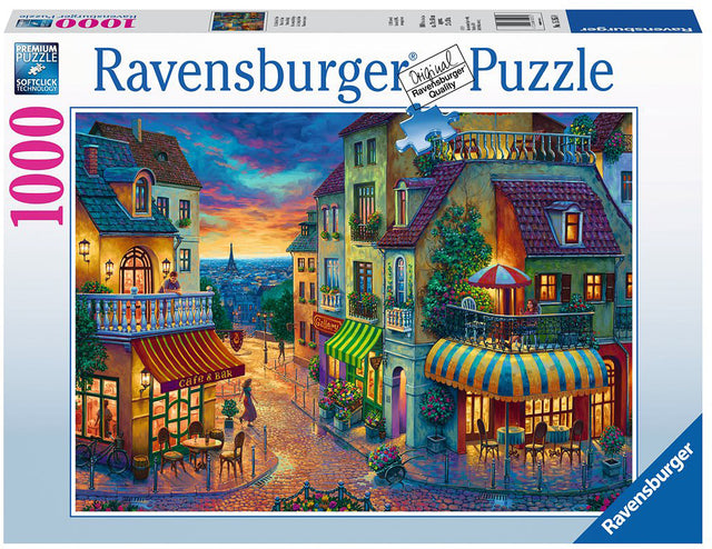 1000 pc Puzzle Challenge yourself with a 1000+ piece puzzle from Ravensburger! With a wide range of images and designs to choose from, including favorite characters, adorable animals, fantasy images, landscapes, monuments, and more, we've got the perfect puzzle for every puzzler. Assemble the pieces to reveal a special view over Paris and the Eiffel Tower in the twilight hour. One of the more popular piece counts among avid puzzlers, Ravensburger 1000 piece puzzles are create a challenging and satisfying experience from our strategic image selection to our unmatchable quality.Puzzling is more than just fun! Puzzling develops logical thinking and problem-solving skills, memory, focus, and concentration, and builds confidence. Plus, it's a great way to unplug, relax, and destress.Ravensburger puzzles are designed to be a positive, frustration-free experience. Our steel-cut pieces offer a perfect, interlocking fit with no tearing or dust - and no two pieces are ever the same shape! Extra-thick cardboard pieces mean your puzzle will last for years. And our fine, linen-structured paper eliminates glare so you can really see the pieces. Ravensburger, bringing families together since 1891.