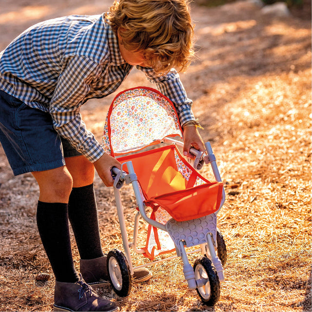 Inspire hours of imaginative, nurturing play indoors or outdoors! Teach responsibility as kiddos bring their dolls, stuffed animals, or toys on adventures. This high quality 3-wheeled stroller has durable wheels so kids can push it along in front of them on grass or sidewalks. It features a gender-neutral orange and floral pattern, easy grip handles, and sturdy straps which allow your child to immerse themselves in imaginative play while keeping their babies safe and sound. It folds easily for storage and fits dolls up to 18". Adult assembly required.