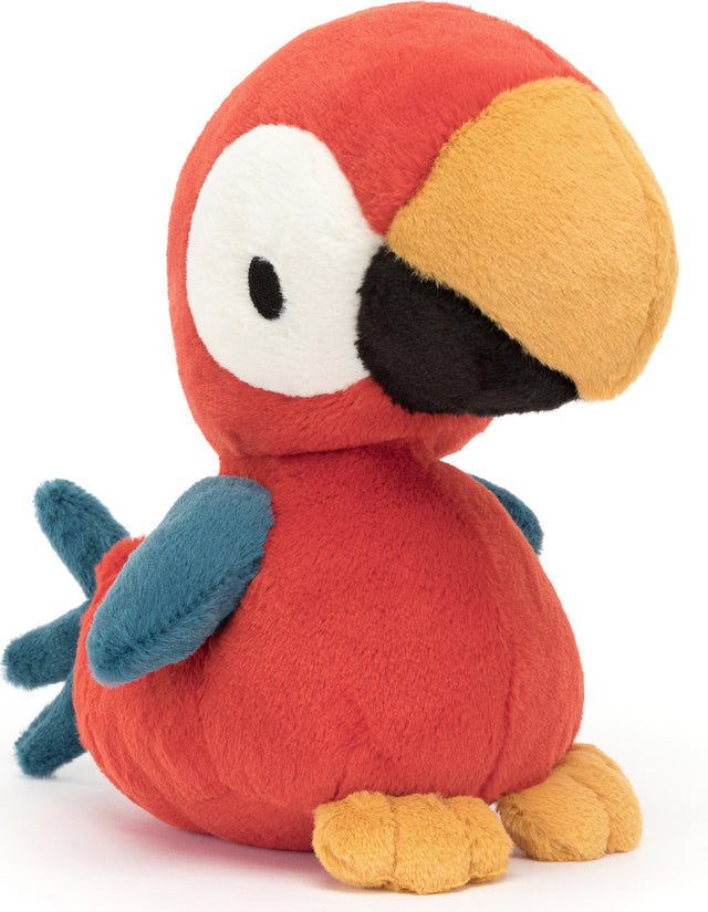 Bodacious Beak Parrot is an absolute riot! This scarlet parrot is bright and quirky, with a chunky black and mustard beak. With soft golden claws, white eye-patches, chalk-blue wings and an inksplash tail, this macaw is a raucous pal.