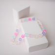 This bumpy bead bracelet is made with blue, pink, and purple frosted beads, alternating between smaller clear beads. Be sure to check out its matching bracelet!