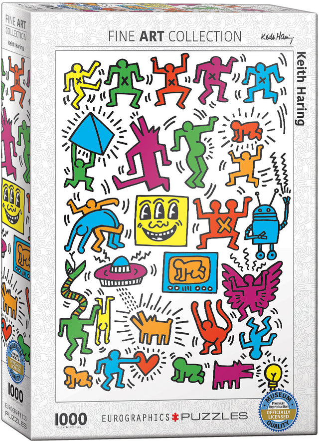 Puzzle is 19.25 x 26.6 inches completed. Made in USA with 100% recycled blue board paper. Keith Haring was born on May 4, 1958 in Reading, Pennsylvania, and was raised in nearby Kutztown, Pennsylvania. He developed a love for drawing at a very early age, learning basic cartooning skills from his father and from the popular culture around him, such as Dr. Seuss and Walt Disney.