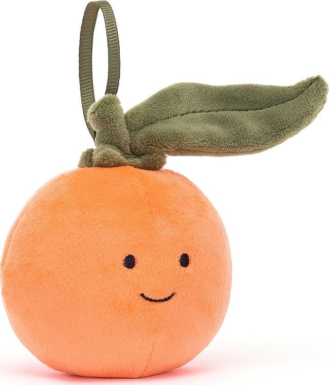 Festive Folly Clementine is a zingy addition to any Christmas tree! This plump orange pal has a welcoming smile, green suedette stalk and stitch-detail leaves, and a neat loop of grosgrain ribbon. A kooky fruit full of vitamin glee!