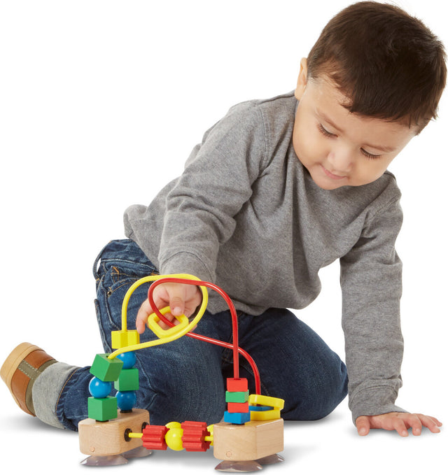 Sitting in a high chair is much more fun with this fantastic bead maze. Featuring brightly colored, multi-shaped beads that spin and slide along red and yellow wire pathways that are anchored by a strong suction cup base. Encourages color recognition, eye-hand coordination and fine motor development through play!
