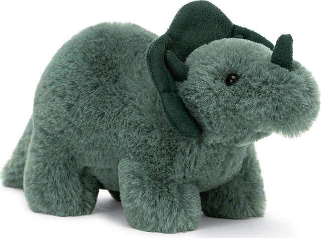 You always know when Fossilly Triceratops is coming - the ground starts to wibble and wobble! This snuggly pal has soft teal fur, three squidgy snoot spikes and a very fine frill, not to mention a lovely long tail!