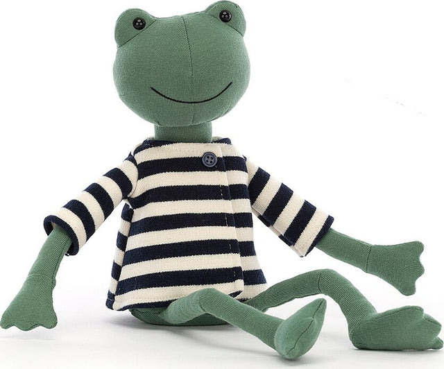 Stylish in stripes and loveably lanky, Francisco Frog loves to sit by the river! Jumbly-joyful, with long, loping legs, this bobble-eyed buddy is such a swell swimmer! Take Francisco's flipper and this green guide will show you the best spots to feed the ducks!
