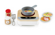Learn to cook with this realistic stove with frying pan. Works with an inbuilt fan which makes the food turn in the pan like it`s bubbling, sizzling or frying. No heat! Includes six recipes on three felt discs, one metal spatula and a set of salt and pepper shakers which click when the tops are turned.