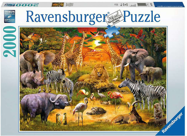 2000 pc Puzzle Challenge yourself with a 1000+ piece puzzle from Ravensburger! With a wide range of images and designs to choose from, including favorite characters, adorable animals, fantasy images, landscapes, monuments, and more, we've got the perfect puzzle for every puzzler. Assemble the pieces to get a close-up look on exotic animals gathering at a watering hole. Ravensburger 2000 piece puzzles are create a challenging and satisfying experience from our strategic image selection to our unmatchable quality.Puzzling is more than just fun! Puzzling develops logical thinking and problem-solving skills, memory, focus, and concentration, and builds confidence. Plus, it's a great way to unplug, relax, and destress.Ravensburger puzzles are designed to be a positive, frustration-free experience. Our steel-cut pieces offer a perfect, interlocking fit with no tearing or dust - and no two pieces are ever the same shape! Extra-thick cardboard pieces mean your puzzle will last for years. And our fine, linen-structured paper eliminates glare so you can really see the pieces. Ravensburger, bringing families together since 1891.
