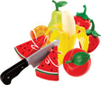 Get used to eating healthily with this cute fruit set. Includes one realistic play knife, two strawberries, one pear, one orange, one apple, with removable stalks and one slice of watermelon all of which can be sliced with the realistic play knife and one peelable banana.