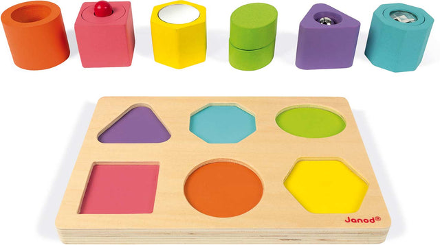 Janod I Wood Shapes and Sounds takes the shape sorting game to a new level of fun. Each of the 6 wooden shapes are color coordinated to match a space on the base, just like a traditional sorter. These brightly colored wooden shapes feature a different sight or sound activity. The orange circle is a rattle, the pink square squeaks, the yellow hexagon has a mirror, the green oval clicks, the purple triangle has a bell and the blue octagon has a kaleidoscope. Includes 6 Activity Blocks (1.75in/4.5cm tall) and storage tray (8x5.25in/20x13cm). Recommended for children 1-3 years of age.