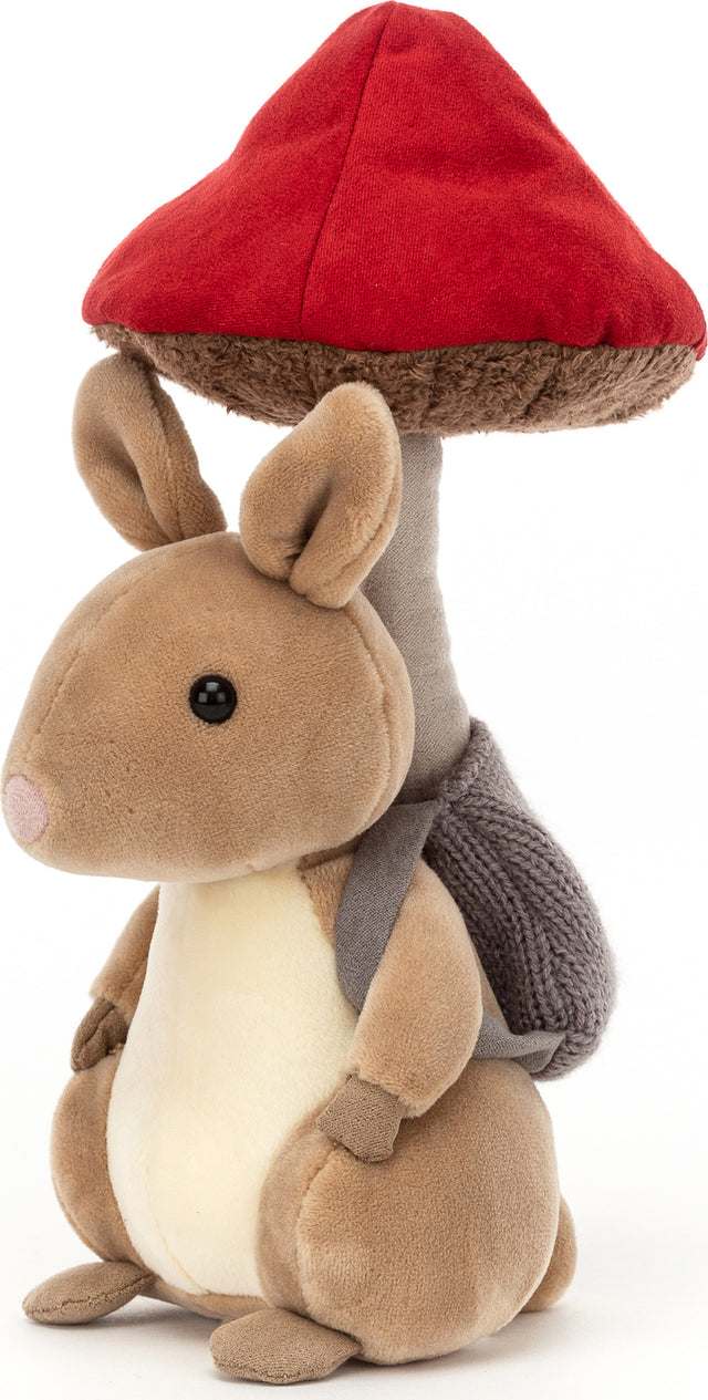 Fungi Forager Bunny loves roaming the forest, looking for tasty treats! A stretchy bunny with bright shiny eyes and a beautiful buttercream belly, this forager's found a fine scarlet toadstool with cocoa frills and a squashy stem! Into the knitted backpack it goes, ready to study later!