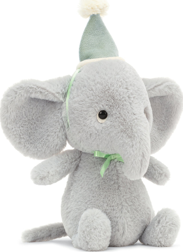 Jollipop Elephant has just finished blowing up the balloons! Having a trunk sure is handy! With a perky, pompommed party hat tied with satiny ribbon, this gentle, dove-grey buddy is now ready to sit at the table and get stuck into all that party grub. Watch those floppy ears!