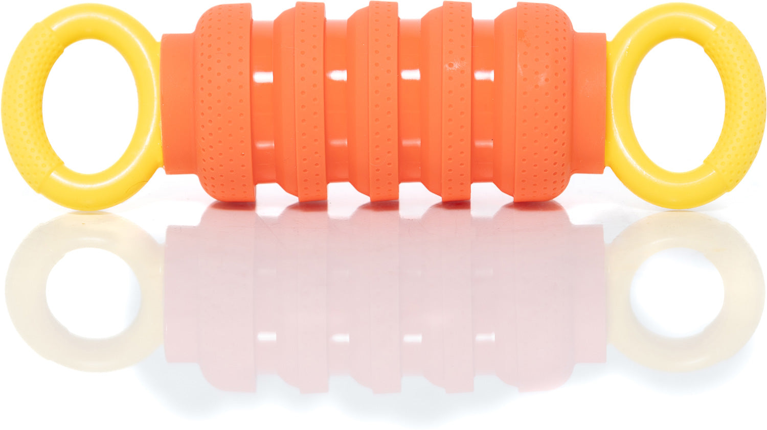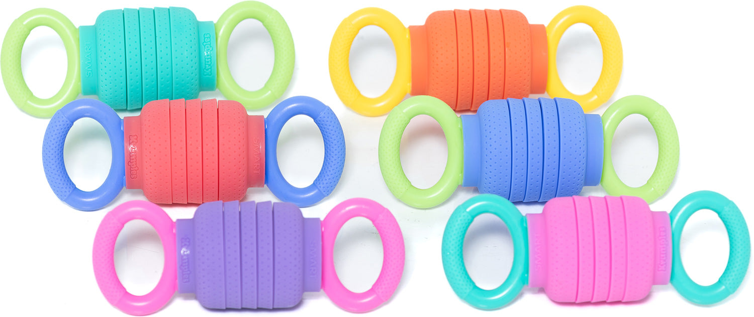 A brand new fidget for babies that's so fun adults will want to play too! Discover a delightful crumple sound as this clever plaything is pulled apart and squished together. The food-grade silicone is safe for teething, and easy-grip handles and textured surfaces make Krumples Pully extra irresistible. This take-anywhere cause and effect toy is 7" closed, 9" open, and best of all... dishwasher safe! Available in 6 fun color combinations. Styles and selection may vary. Each sold separately.