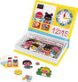 Magnetic educational game in cardboard to learn time. Composed of 75 magnets and 8 cards printed on both sides (=16 scenes). Once the book is opened, the aim is to make on the stage the same scene as indicated on the card thanks to the magnets. The game is unisex as there's a boy and a girl on each card (front side : boy, back side : girl).