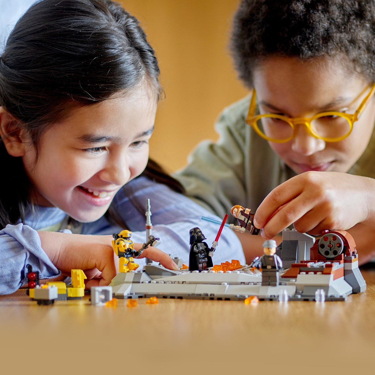 This LEGO Star Wars collectible set features a battlefield with 2 rotating battle platforms, a battlefield-splitting fire pop-up function and a mining cart that can be knocked over. Also included are Obi-Wan Kenobi and Darth Vader, each with lightsabers, Tala Durith and droid NED-B LEGO minifigures – to play out Star Wars: Obi-Wan Kenobi scenes. Kids join Obi-Wan Kenobi on the battlefield for another daring duel against Darth Vader. Jump over the barrier of fire to confront the Dark Lord of the Sith and avoid the exploding mine cart as the duel rages on. Imperial Officer Tala Durith and the droid NED-B arrive just in time to witness the epic battle!