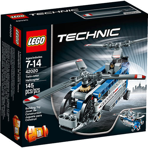 Get your LEGO Technic model building off to a flying start with the 2-in-1 Twin-rotor Helicopter. Featuring linked spinning rotors, an opening cargo door and cool rescue styling, this great model offers just the right level of challenge for first-time builders. It also has a turning front wheel for easy maneuvering on the ground. Rebuilds into a single-rotor helicopter.