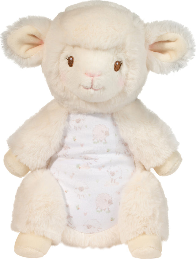 Fleecy and soft, Lennox the Lamb Chime stuffed animal is a delightful friend for Baby to snuggle! This sweet faced companion features rosy pink cheeks and an endearing embroidered expression. Shake Lennox gently to hear a musical chime sound from within. Lennox's seated pose and ultra soft plush materials are extra huggable and will invite Baby to interact. A charming Douglas exclusive print of a flock of woolly sheep frolic across Douglas' little Lamb's belly. Combine this Chime plush with any of the other pieces in Douglas' Lennox the Lamb collection to create coordinating sets, perfect to give as a gift or keep for your own nursery.