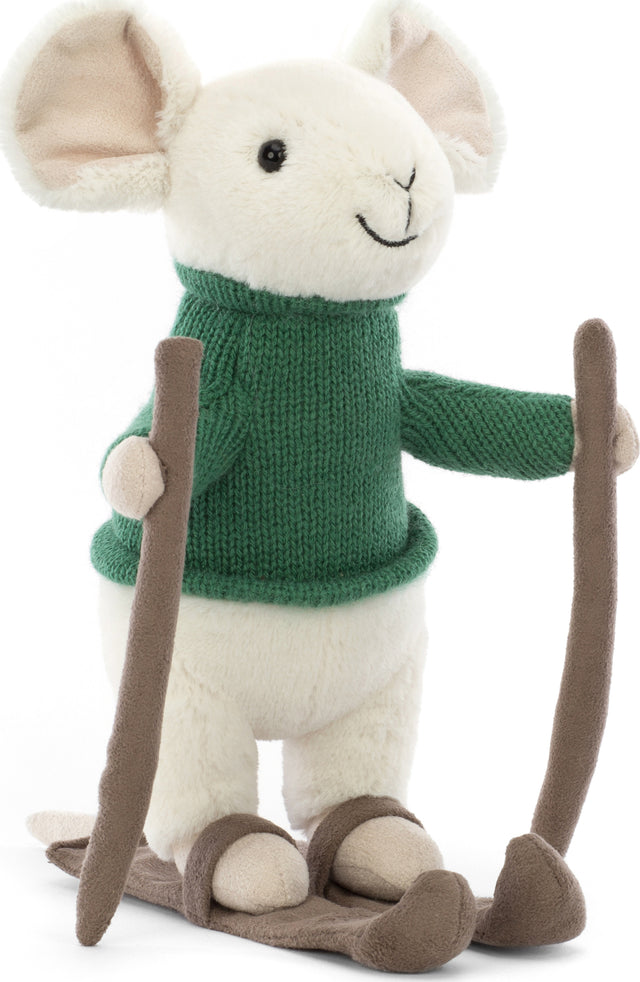 Ready? Let's go! Merry Mouse Skiing is out on the slopes, wearing a snazzy forest-green jumper! This cute cream mouse has suedey skis and poles, just the right size for a miniature slalom! With rumpled ears, suedey paws and the sweetest expression, this one's going for the gold!