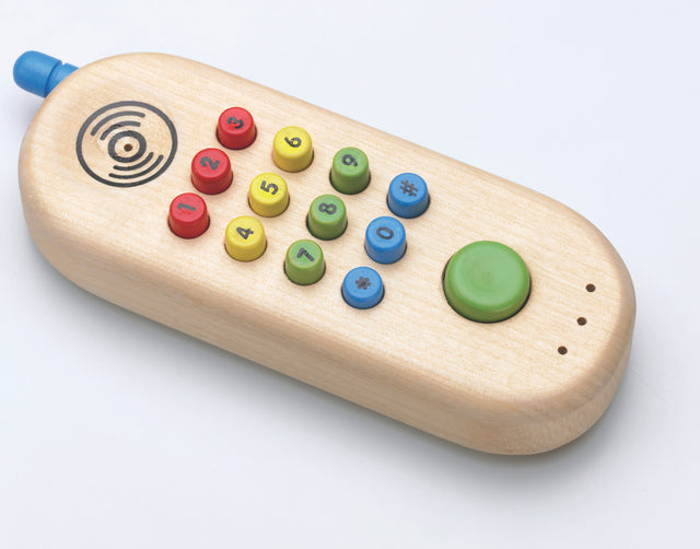 This highly crafted wood realistic first cell phone toy , will provide the young caller with hours of imaginative play. The cell phone has a built in ringing sound when the green button is pushed. All multi colored numbers all depress into the phone. Retail box packaged- pegged. 6" L x 2" W. 12 months +. Barcode 693409590564.
