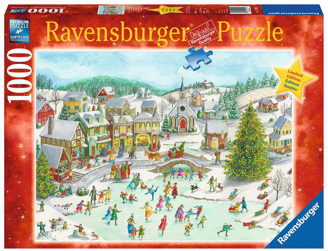1000 pc Puzzle Challenge yourself with a 1000 piece Christmas puzzle from Ravensburger! With a wide range of images and designs to choose from, including favorite characters, adorable animals, fantasy images, landscapes, monuments, and more, we've got the perfect puzzle for every puzzler. Assemble the pieces to reveal a joyful Christmas scene featuring a festive town full of residents enjoying a beautiful Christmas day, sledding, ice skating, and playing in the snow. One of the more popular piece counts among avid puzzlers, Ravensburger 1000 piece puzzles are create a challenging and satisfying experience from our strategic image selection to our unmatchable quality.Puzzling is more than just fun! Puzzling develops logical thinking and problem-solving skills, memory, focus, and concentration, and builds confidence. Plus, it's a great way to unplug, relax, and destress.Ravensburger puzzles are designed to be a positive, frustration-free experience. Our steel-cut pieces offer a perfect, interlocking fit with no tearing or dust - and no two pieces are ever the same shape! Extra-thick cardboard pieces mean your puzzle will last for years. And our fine, linen-structured paper eliminates glare so you can really see the pieces. Ravensburger, bringing families together since 1891.