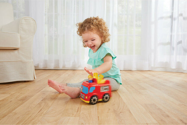 The Kidoozie Press 'n Zoom Fire Engine features lots of little enticing details. The wheels spin and the ladder jumps as it rolls. Plus it comes in bright, enticing colors with safe rounded edges, and even features a little dog pictured behind the windshield. You want to give your child good role models from the start like doctors, firefighters, and police officers. Now with the Press 'n Zoom Fire Engine, they have a little hero of their own to help. They'll have hours of fun getting their pal to the scene of the blaze. The Press 'n Zoom vehicles from Kidoozie move without any power source. All you have to do is press the hero's head and watch the vehicle race across the floor. No batteries required! It's the perfect toy that never stops rolling. Kidoozie toys are engaging, educational and FUN. Our broad range of high-quality toys have won numerous awards and are safe and well designed. Innovative toys encourage movement, problem-solving and pretend play through various themes. Stimulate the imagination and enable learning through play. Package contains (1) Kidoozie Press 'n Zoom Fire Engine with press and go action. Features moving ladder, peek-a-boo head, and spinning wheels. No batteries required. Recommended for children ages 12 months and older.